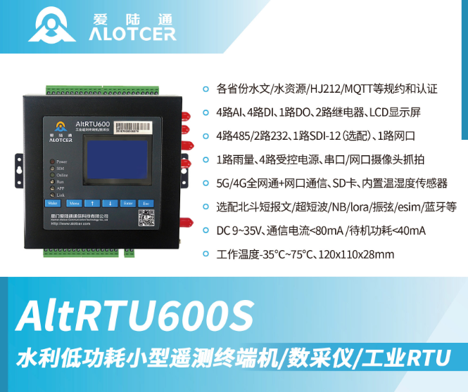 爱陆通AltRTU600 5G视频水利RTU是基于2G/3G/4G/5G/Ethernet /NB-IOT/LoRa等通信功能于一体的低功耗工业遥测终端机/数采仪。爱陆通AltRTU600 5G视频水利RTU采用高性能的工业级32位通信处理器和工业级无线模块,以嵌入式实时操作系统为软件支撑平台,www.alotcer.com,实现数据采集、存储、显示、控制、报警、远程传输和远程管理等综合功能。