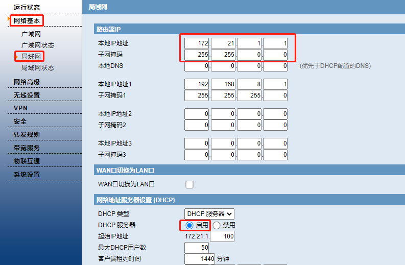 服务端子网网段设置(根据需求响应更改)172.21.1.1/24,一定要启用DHCP